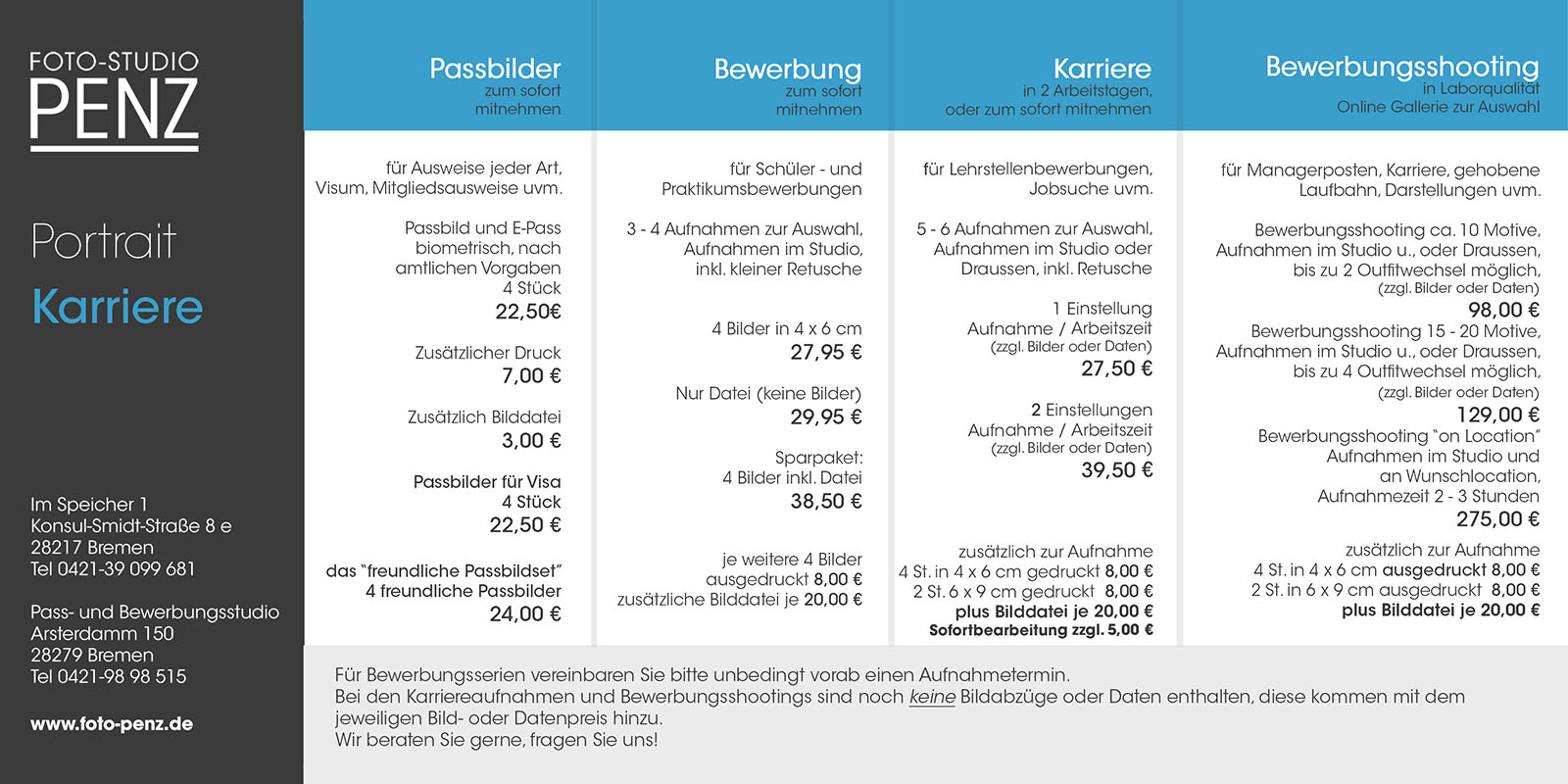Wir bieten verschiedenste individuelle Aufnahmepakete für Ihre Bewerbungsfotos an.
